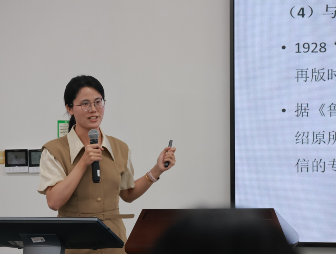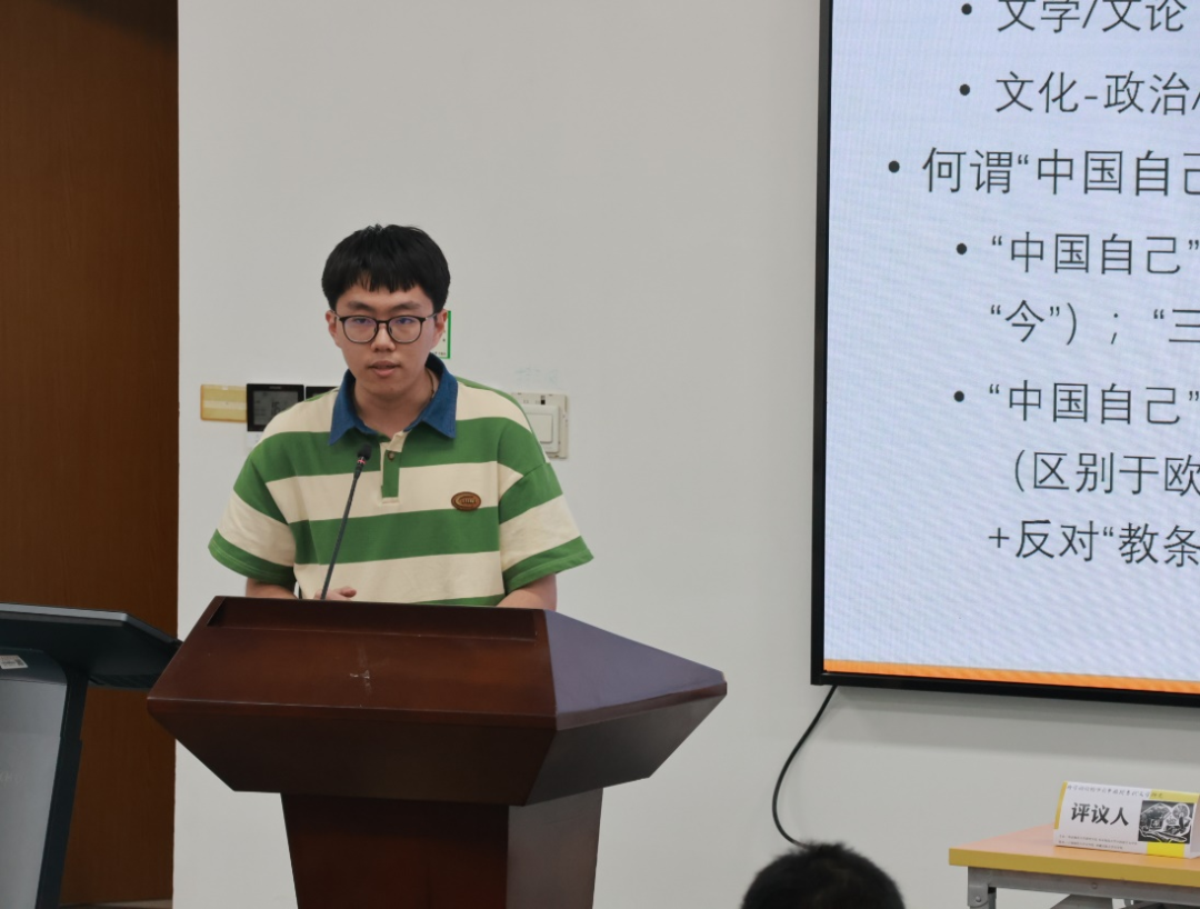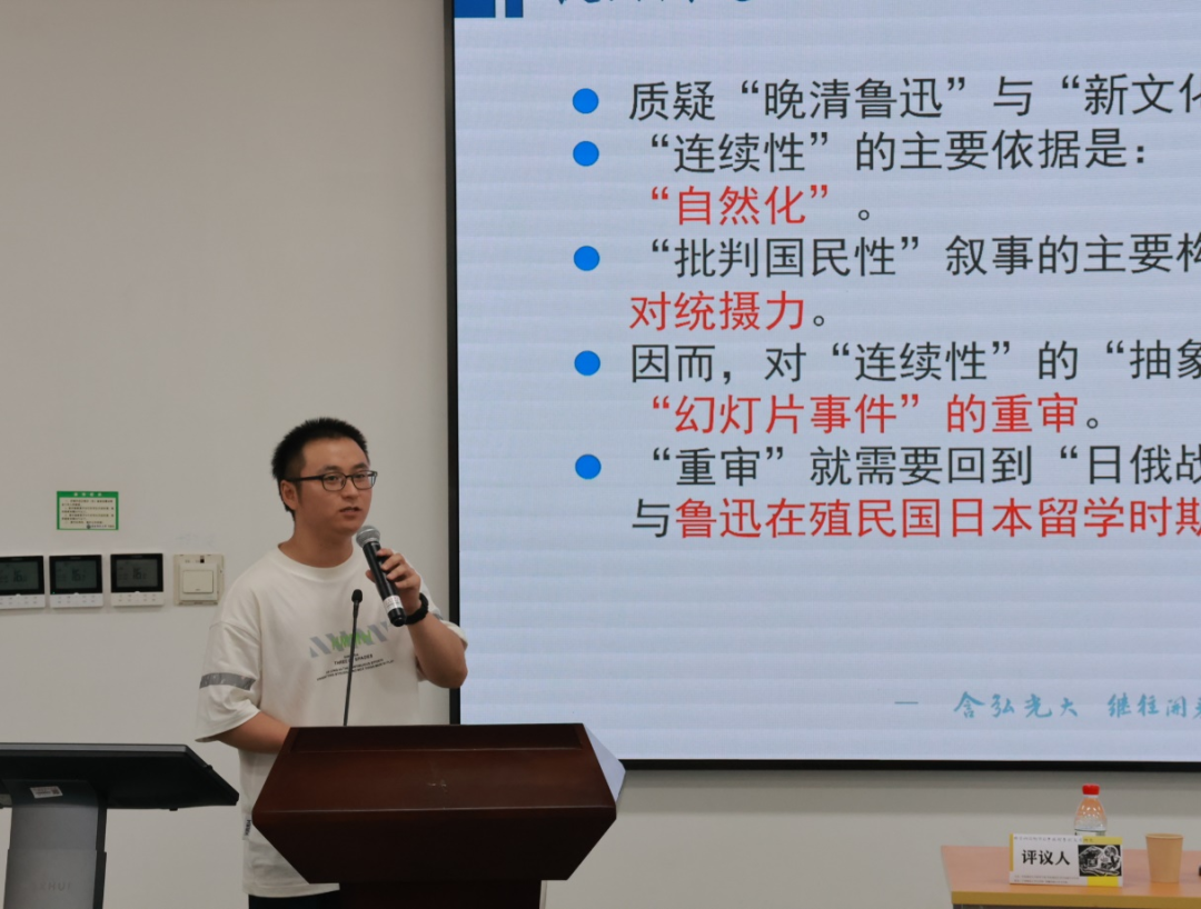 黄英豪同学以“被遮蔽的另一个‘幻灯片事件’”为研究的问题导入,指出鲁迅是在“日俄战争”影响下的“仙台军国主义氛围”中,生成了批判西方殖民性的思想理路,并进一步阐释鲁迅在回国后,因“地理位置”与“文化位置”的转换,构筑了“批判国民性”的“启蒙”叙事,其创作发生了“二重转向”,当“启蒙”失落后,鲁迅走向了“彷徨”。薛晨鸣同学从通读鲁迅作品的阅读体验出发,引出了作为介质的“迷信”话语这条线索,从早期鲁迅“迷信可存”的生发、矫正早期“迷信可存”的预设内涵、建构以“民族的脊梁”为主体特质的“人国”历史脉络三方面展开介绍,探讨鲁迅的“人国”构想调适与民族主体更新。高岩同学以鲁迅的翻译实践作为打开文学鲁迅研究的路径,说明了鲁迅在译介、吸收卢那察尔斯基思想的过程中发生的知识结构的“左倾”转变,这一翻译实践在文学创作上的影响,以《非攻》《理水》为例,“新人”获得了“人民性”和“行动性”,实现了“个人”走向“大众”。唐洁同学的介绍以“立人”思路切入“王得后鲁迅”这一论题,从王得后创见性地提出将“立人”作为鲁迅研究的一维核心、在时代风潮中发展“立人”之思、以“立人”思想为本位的写作实践三个部分展开,凸显了鲁迅研究与当代社会现象的交流。白新宇同学以《周作人日记》的阅读记录为线索,爬梳了周作人文学观念的若干思想资源,从“国民精神”思想的萌发、“诗言志”传统的重构、对宏德《文学概论》的创造性编译、批评章太炎文学观四个部分,探讨周作人留日时期文学观念内在理路的构建。