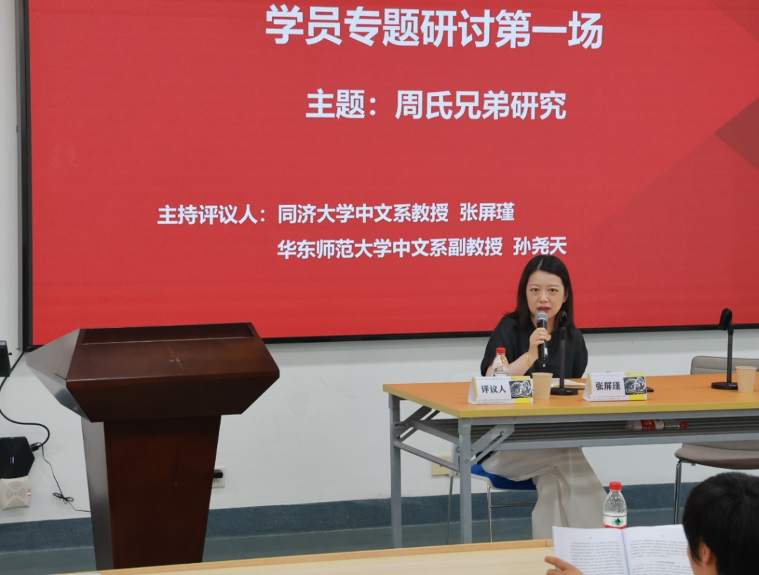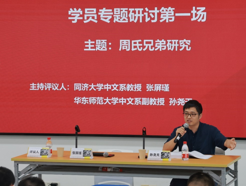 在提问环节,针对学员提出的“当代印刷模式对于共同体想象的重构”问题,梁展教授以“新文化史”研究为例,表示路径研究需要进行大量细致的实证工作,而短视频等细碎化传播媒介则更为复杂,当代集体认同的形成机制仍亟待学界进一步的关注与探索。面对“与台湾的对话何以可能”的问题,梁展教授剖析出台湾民族自决诉求背后共同体教条潜意识,并提醒学员们,需要重视文学折射政治复杂性的重要作用,同时分析问题要与当下时代紧密贴合。 7月25日下午13:30,以“周氏兄弟研究”为主题的第一场学员专题研讨正式开始。研讨由同济大学600cc全讯白菜网张屏瑾教授、华东师大600cc全讯白菜网孙尧天副教授担任主持评议人,来自西南大学、中山大学、南京大学、温州大学、北京师范大学的五位研究生依次进行了汇报。