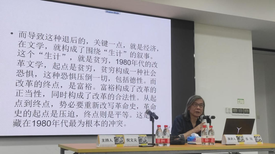 接着,蔡翔教授指出第三点“生产关系和生产力”的命题,1950-1970年代的政治不只是伦理问题,还是道德问题,而“退后一步”的关键就是经济,在文学创作上则表现为围绕生计的叙事,1980年代的改革文学的起点是贫穷,贫穷构成了一种社会的恐惧,这种恐惧压倒包括德性等一切要求,而改革的重点是富裕,富裕构成了改革的正当性和合法性。因此在1980年代如何解放生产力是实践的重要内涵,但是政治并没有消失,生产力中间隐藏了重新政治化的要求。可以说1980年代的文学围绕这个概念展开,并在在展开的过程中生产出了新的冲突,尽管在1980年代,所有制并未根本变动,但是私有经济的成分开始出现,个人也从精神走向物质。第四点则是“大同和小康”,蔡翔老师认为公有制构成了1950-1970年代的核心,并在文化上激活了大同思想等传统,因此不存在纯粹的社会主义和社会主义意识形态。1950-1970是道德(传统)隐藏在社会主义里,而1980年代则是社会主义隐藏在道德(传统)中。所以社会主义改造是公对私的改造,这个改造既指向所有制,也指向人心和教化。然而在农村却具有特殊性,尽管农村也在进行社会主义改造,但不可能彻底,由此呈现出公私兼顾的1950-1070年代的农村现实,1980年代的改革则从农村开始重新强调公私和经济的关系,因此“退后一步”在思想史上即是从大同推向小康,例如在合作化小说的背后,隐蔽表现出写作者的大同理想,而在1980文学表现为则是小康的问题,“私欲”构成了1980年代文学隐蔽的叙事动力,并成为一种新的崇高的美学形态。最后一点则是“一元论和多样性”,1950-1970年代的文化场在思想上是一元论,在制度上则是一体化,这种“一元化”激活了一部分思想乃至文学的潜力或者活力,同时也压抑了另外的思想和文学的活力,“思想的压抑”造成了思想者的“苦闷”,而“苦闷”需要“觉醒”,也促成了1980年代的“苦闷-觉醒”的叙事逻辑,最后也构成了现代史上三种基本的叙事逻辑:压迫-平等、贫穷-富裕、苦闷-觉醒,这三种叙事逻辑分别对应革命和改革和启蒙。蔡翔教授最后总结道1980年代特点之一,正是所谓的“退后一步”,是从激进的政治实验上的“退后一步”,这个退后逐渐确立了改革的内涵,贫穷是1980年代改革的最为重要的理由,因为贫穷这个概念的存在彻底清除了倒退的可能,所以1980年代的退后一步,实际的面向是未来,而不是过去,可以说,1980年代的意义在于通过各种冲突和探索,为下一个时代提供了各种选择的可能。