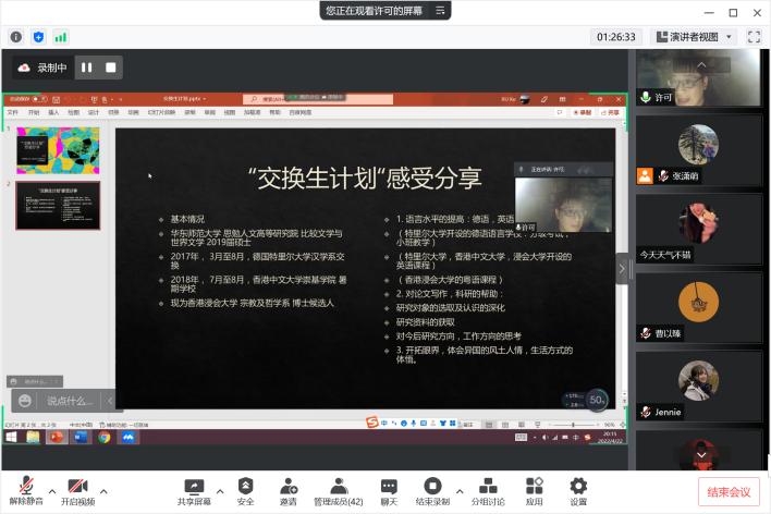 分享会伊始,张潇萌老师逐一介绍了中文系海外交换生项目以及与哥廷根大学共建的本科双学位项目的具体情况,鼓励同学们提前做好准备,把握机遇,开阔国际视野、提高综合素质。