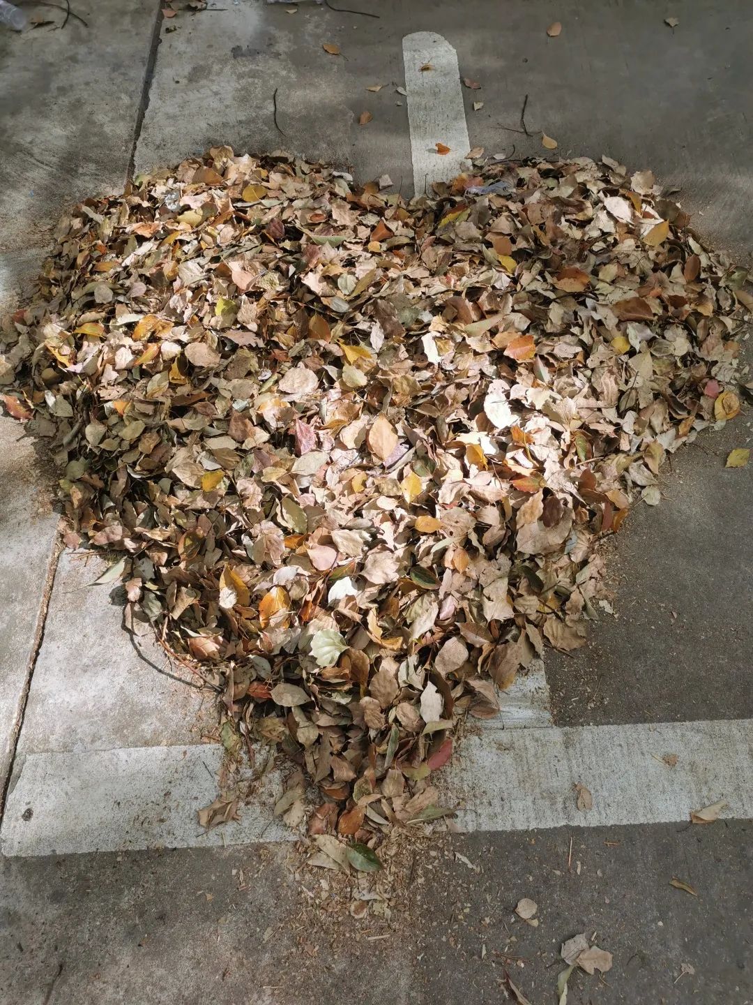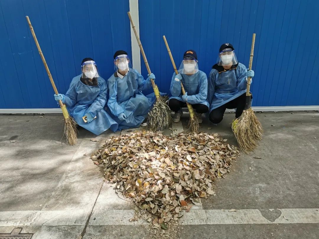老师帮他们找11号楼的阿姨要了4个扫把,2大2小,又从13号楼的车棚里拉了两个空的垃圾桶——这就是全部的清理工具了。孙雅茹和其他小伙伴们先是把铺满整个干道的落叶扫成一堆一堆的状态,然后再一堆一堆把落叶装进垃圾桶,每装满一次,就把垃圾桶拖到靠里的草坪上倒一次。他们四个人干了整整三个小时。扫叶子都不是最累的,最累的是把叶子弄到垃圾桶里。孙雅茹提到,因为他们没有簸箕,只能把空的垃圾桶放倒,一个人用大扫帚把叶子往里怼,另一个人用小一点的扫帚把沿着垃圾桶口往两边外溢的叶子扫拢回堆状。等垃圾桶装了过半,叶子怼不进去的时候,再把桶扶起来,用废纸箱拆下的两块儿纸板做“簸箕”,一点一点把剩下的叶子往里装……那天出门匆忙,孙雅茹也不知道是要干体力活儿,所以没换衣服,穿了秋衣、毛衣和棉袄,回寝室的时候,连棉袄都汗湿了。在谈及感想时,她说每一个工作都没有它听起来或者看起来那么轻松。“很多同学因为在寝室闷久了,所以很想出来做志愿,但志愿工作真的不是那么容易的。落叶看起来很美,但清理的时候才知道,真的很脏。无数的灰尘无数的汗。大扫帚很沉,扫一堆就能累够呛;小扫帚太不顶用,扫一堆出来要废很多气力。就算后期有鼓风机辅助了,但仪器本身是很重的,长时间端着工作也十分劳累。这还只是一条道,还只是学校里的一条道,还只是春天,气温还没有飙到三十六七度,我们还只是二十岁出头,体力尚好。很难想象平时的环卫工人穿着橘色工装起早贪黑的辛苦。每一个职业都值得尊敬。少一点抱怨,多一点理解,是这个疫情当中最需要的。”用扫出的落叶摆出了一个大大的爱心