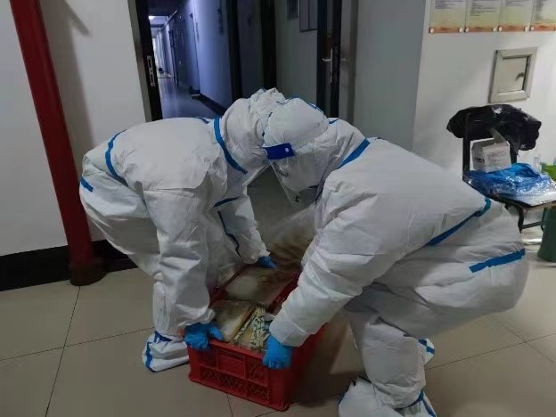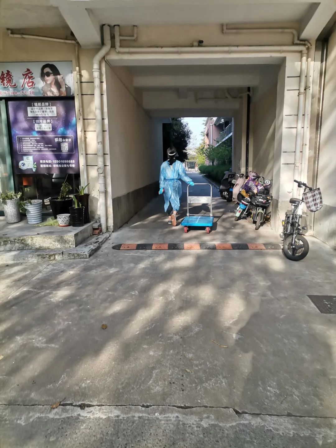 和楼内送餐志愿者不同,出楼送餐志愿者服务的范围涵盖整个片区,主要任务是将三餐从研寓门口送到各栋楼楼下。首先是接餐,其次是按每栋楼的需求量将饭分好,最后用小推车、小三轮分批送到楼下,其中卸和装都是比较耗体力的事。