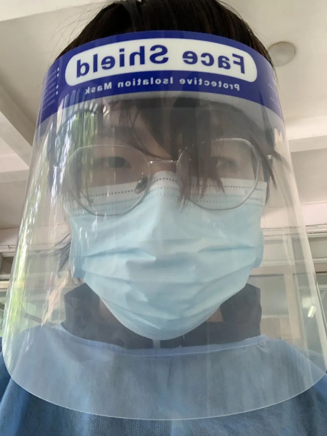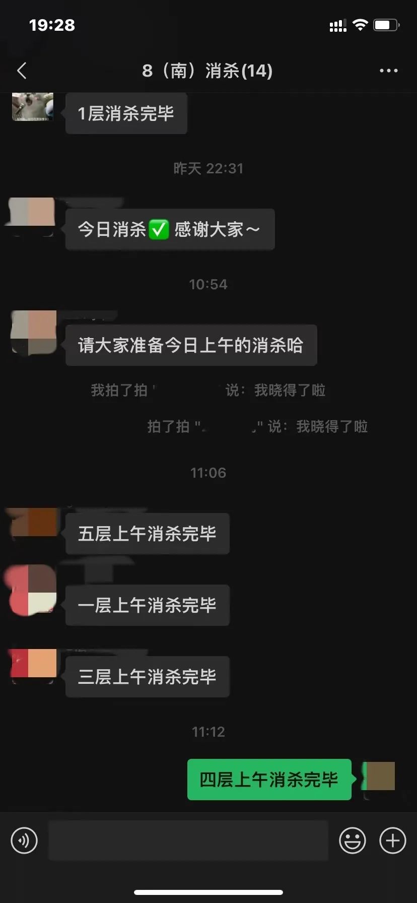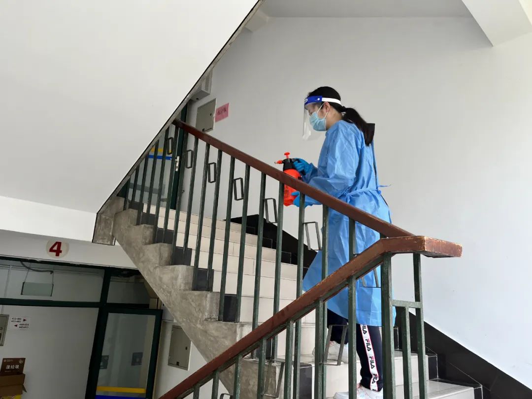 足不出户的生活已经过去了一个多月,但是发餐发饭、接水等等楼内活动不可避免,使日常的室内消杀成为必要的防疫措施。研寓北区的室内消杀防疫队由一百多位志愿者组成,正式组建后,每日需要在上午11:00与晚上9:00对楼道内重点部位进行消杀,主要包括每个宿舍的门把手、放置三餐和物资的箱子、本层下行楼梯扶手、窗台及地面。每次消杀前,李欣迪都会在楼层群里提前十分钟进行提示,请同学们暂时不要出门。由于含氯消毒剂具有漂白作用,她们也会谨慎地避开同学们搭在楼梯间扶手上晒太阳的被褥和衣物,避免褪色。消杀结束后,李欣迪也会告知大家可以出门,同时在消杀群内汇报完成情况。