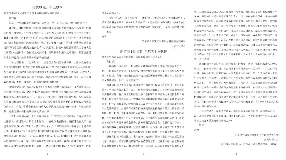 提及工作感想,陶文倩说:“我没有穿上防护服,像医生一样在核酸采样点为大家采样,或者像志愿者们一样在一边引导大家,一站便是数小时。但即便是督促大家做核酸、统计大家做核酸的情况、发放抗原试剂盒,这些微不足道的工作就已经常常让我感到疲惫。推己及人,那些真正奋战在一线的工作人员、医务人员,他们日复一日的坚守,更令人钦佩。”在疫情席卷下的华东师大校园,每天早上七点左右,伴随着鸟儿的啼鸣,志愿者们便早早起床,化身为餐食配送者,将三餐清点数量、搬运,配送至每个宿舍门口,挨户敲门,细心认真地放饭,确保让每位同学都能够尽快吃上饭菜。一间又一间、一趟又一趟,黄恋迪作为送餐志愿者,不厌其烦地重复着弯腰放饭、抬手敲门的动作。从早上晨光熹微到中午日光正盛直到晚上落日余晖,从窗外廊前的细微凉意到头顶肩上的明媚阳光,志愿者们日复一日地把温暖送到每一个宿舍,一个个忙碌的身影,上上下下在楼栋里面来回的奔波,带来了春日里一份份温暖人心的餐食和感动。