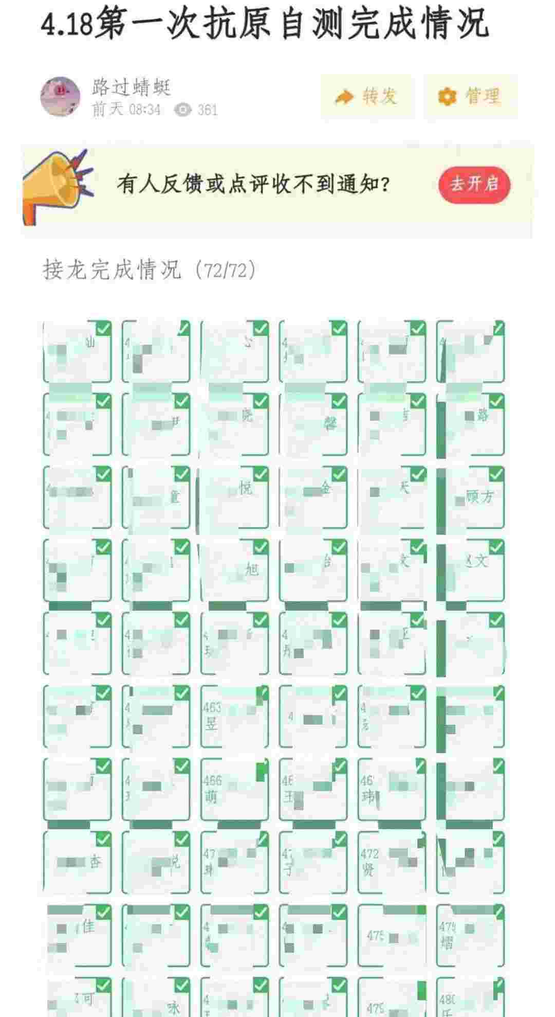 一日有十二时辰,在这段特殊的日子里,有一群来自600cc全讯白菜网的志愿者同学们,默默奋战在每一个时辰,用不同的行动守护校园。提醒并督促楼层内的同学们按时做核酸是一项非常重要的工作任务。通常,学校老师会提前一天通知各楼层长第二天的核酸检测要求,包括各楼栋的检测时间、地点以及检测人员名单等等,再由核酸志愿者转达给楼层内的同学。陶文倩就是负责该项工作的志愿者。清晨,很多同学还在睡觉,陶文倩就早早起床,并在规定时间内叫醒每一位同学,避免耽误核酸采样的整体进程。她负责的楼层有44间宿舍、73名同学,数量相对来说比较庞大,所以她在楼层内采取了“片区制”,将楼层分成三个片区,每个片区安排一位负责人,每次做核酸,楼层内的同学都会提前在楼道内按片区分成三个小队,由负责人清点各组人数,集合完毕后等阿姨通知,然后迅速带下楼,避免在楼下磨磨蹭蹭排队等候的状况。与此同时,负责引导核酸检测队伍秩序的黄琦也早早起床,为接下来的工作做好准备。从三月中旬开始,她就担任多个岗位的志愿者,被有些志愿者称为“老同志”。在同学们做完核酸后,楼层长需要及时统计核酸检测情况,陶文倩通常是在队伍出发后的五分钟在楼层群里发布“接龙管家”小程序,提醒同学们完成核酸后立刻进行反馈。十几分钟后点开小程序,哪间宿舍的哪位同学没反馈,一目了然。接下来她就会挨个儿去这些宿舍敲门询问核酸检测情况,然后尽快将信息上报给楼长。