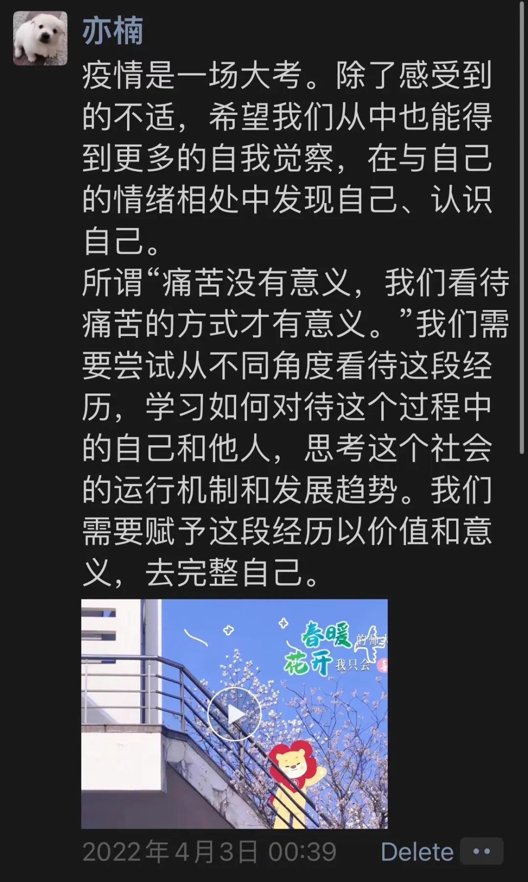 赵航艺在疫情期间曾经参与研究生公寓志愿摄影工作,在做核酸、发放物资等各个点位进行拍摄,留下志愿者为大家服务的每一个珍贵瞬间。她加入8号楼南楼的宣传部,拍摄楼内阿姨、志愿者等工作日常,用于展示志愿者的风貌,并且准备最终以视频形式对外进行宣传,展现疫情下最真实的动态和感人的点点滴滴。拍摄过程中,赵航艺听到了寝管阿姨、志愿者、后勤师傅的很多工作细节,比如寝管阿姨告诉她说:“其实同学们都很好的,阿姨从来不嫌累的,同学们看到都会帮我们,把垃圾袋提到楼下啊,给阿姨送雨伞、雨衣啊等等。”在镜头里,赵航艺看到发饭志愿者们常常选择最重最累的活,运送物资的女孩子们搬起一箱箱沉重的食物,但大家都是满脸笑意,从来没有抱怨过什么。她也用镜头记录了早上给大家送来早饭的后勤师傅送完饭后满足的笑容,哪怕他们早上三四点就要开始打包,然后装车,接着一栋楼一栋楼去送饭……拍摄视频之后,最难的就是剪辑视频,因为前期的素材很多,需要一秒一秒去看去听,才能不错过每一个想要的片段,还要想办法设计好视频的结构,如何承接,如何安排空镜,每一个画面配什么文字和音乐,有时候灵感来了,可以熬夜到凌晨一直在剪视频,有时候也会卡在某个细节处停滞不前,但赵航艺一直坚持,因为她的信念就是一旦开始就一定要做出一个成果。疫情之下,拍摄纪实类的视频不像往常,可以自由发挥,随意拍摄,因为要严格遵守防疫规定,人与人之间保持距离。因此也没有办法去和很多同学进行沟通,得到大家最真切的感受。但赵航艺说:“这个时候,反而更加坚定要剪一个满意的纪录片,保留下来封楼期间大家最真实的生活状态,这一个多月,大家都是被迫分离,但其实心与心的距离反而更近了,我希望能够通过影像,记录下来这已经发生和正在发生的事情,直面生活的点滴,发现那些流动于细微之处不被察觉的关怀和爱意。”除了学生志愿者的积极参与,600cc全讯白菜网多位老师也每日投身抗疫一线。宫亦楠老师是600cc全讯白菜网的硕博士辅导员,也是本科生公寓1号楼的楼长。每天结束了片区内的核酸检测、买饭引导等工作,开完片区例会和辅导员聊天室,收拾洗漱一番,时间接近凌晨。带着从辅导员聊天室里同学的积极反馈,她坐在电脑前继续白天没顾上处理的各项事物。有时是毕业生材料的整理书写,有时是推优评比等事务细节的敲定,有时是所负责楼内日常生活时间表的安排……疫情下大家的生活不能暂停,很多都是同学数着时辰期盼着的,该发布的通知公告和回复的邮件要逐个落实。深夜也适合做一些冥想和回顾,白天的见闻和感受会涌上心头,一些来不及思考的想法会变得清晰。宫老师会梳理当天辅导员聊天室里同学提到的问题,回顾过程中同学聊到的心情起伏,思考自己的反馈是否有未竟之处。偶尔她也会在朋友圈讲些“心里话”,希望能以心理学的思路和角度给同学们分享自己的体会,描述自己在疫情下觉察到的自我情绪变化,以及尝试的自我调适的方法。她觉得适当的冥想和回顾能帮助她跳出事情本身,观察自身的感受、情绪、认知的变化,从而有更多的力量和思路,更好地应对碰到的情况。在她看来,夜晚更是属于辅导员与同学的对话时间。每天跟大家聊聊校内防疫情况能很好地缓解焦虑,并督促大家防疫防护绝不松懈。彼此分享每天的所做所想,有很强的共同抗疫的连接感,师生间相互的鼓励支持让自己与同学们的距离不再遥远。最后带着满足感沉沉睡去,期待第二天又是美好的“阴”天。除了上述提到的志愿者外,600cc全讯白菜网还有许许多多的志愿者同学都投入了抗疫一线,用不同的方式守护着身边的同学,守护着学校,守护着这座城市。青年有担当,国家有力量,志愿者们的汗水与付出,共同汇聚成了这个春天最美的风景。