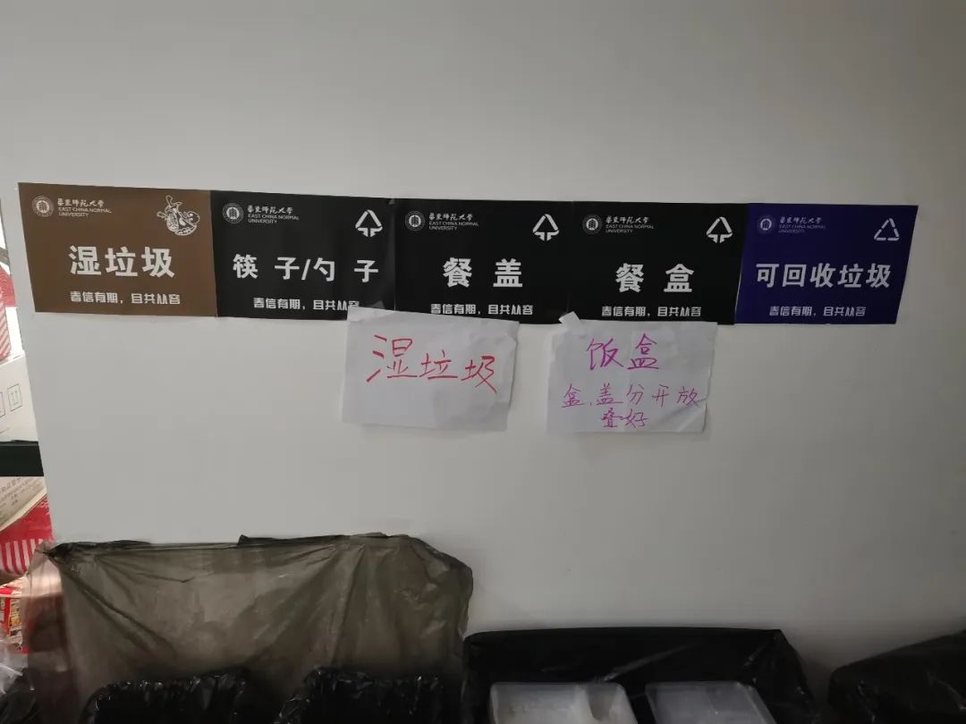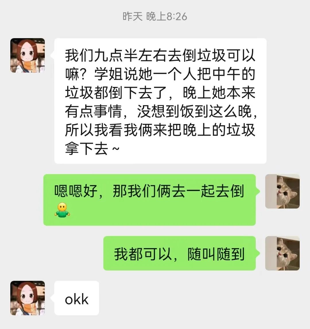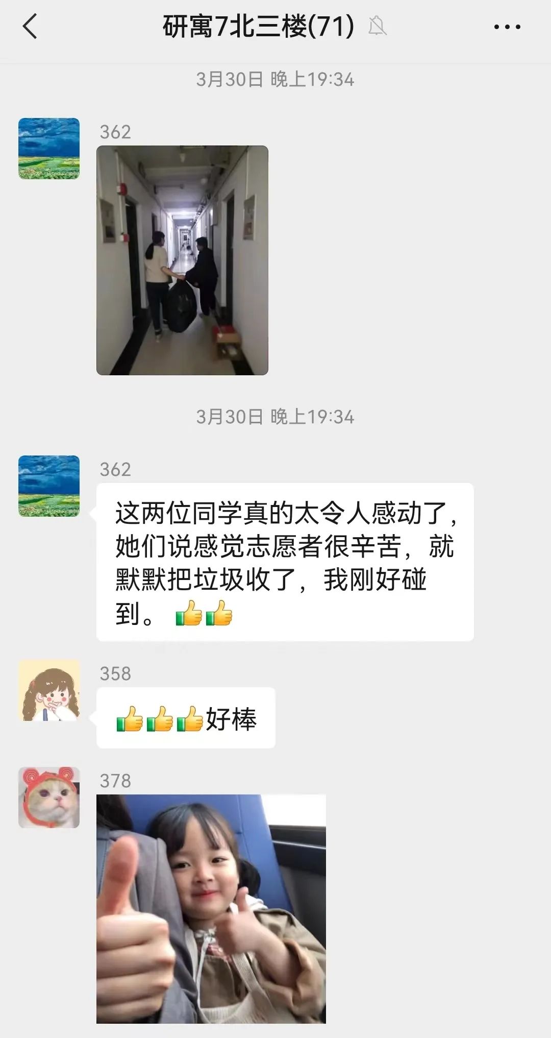 研究生公寓每层楼的楼梯口处均设有湿垃圾、干垃圾、可回收垃圾等垃圾桶,志愿者会分别搬运至楼下。一开始,整栋楼只有一位保洁阿姨清理所有垃圾,了解到阿姨工作辛苦,大家便主动帮忙,何鑫就是其中之一。考虑到每天的湿垃圾都很重,连后勤人员搬上垃圾车都费力,另一名志愿者高全娟建议新增一个垃圾桶。她在群里调侃道:“湿垃圾也要平均分配,以后两桶雨露均沾”。层长陈雨晴还细心地制定了排班表,让志愿者们轮班为大家服务,隔天清理一次垃圾。一开始,志愿者们会提醒大家将型号不同的饭盒分开叠放,在墙上贴上干净的垃圾袋进行遮挡,避免湿垃圾溅脏白墙。慢慢地,楼里的姐妹们都能分门别类、整齐地投放垃圾。何鑫说:“穿好防护服、戴好口罩和手套,能和大家一起干活,是亲切是感动,反而不觉得辛苦。记得前几天,全娟学姐有事情,怕剩下的同学晚上搬运起来吃力,中午便一个人默默把垃圾清理到了楼下。”若是时间有冲突,志愿者们也会相互协调,绝不耽搁。也有同学看到垃圾已满,顺手清理套上新垃圾袋或是直接帮忙放到楼下。
