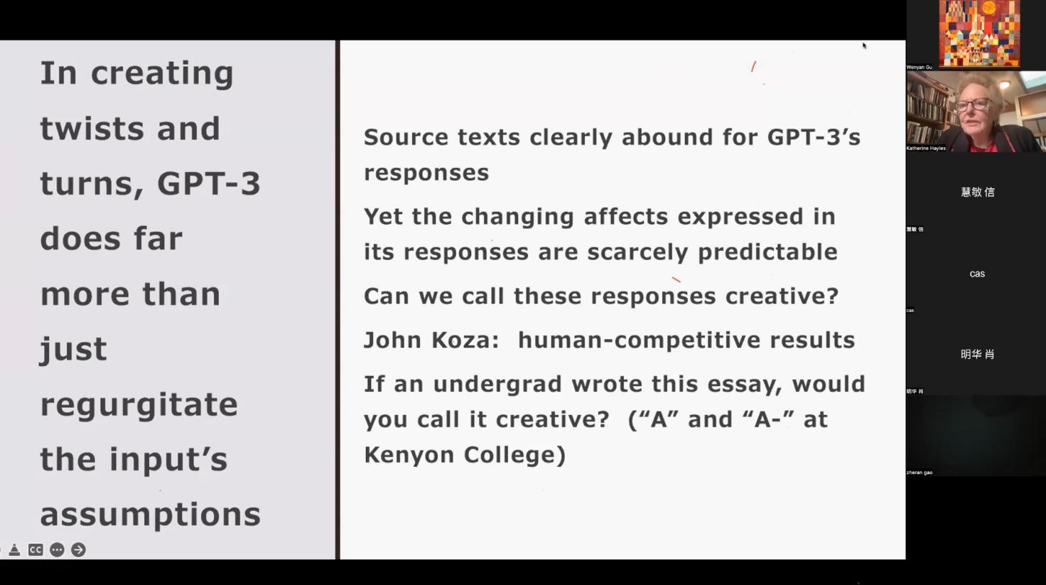 讲座伊始,海勒教授开宗明义地指出人工智能是一个快速发展的领域,它给对文本解释感兴趣的人们带来了挑战。首先,海勒教授列举了递归神经网络(RNNs)、卷积神经网络(CNNs)与长短期记忆人工神经网络(LSTM)的局限性,由此引出本次讲座的核心:由OpenAI开发的人工智能GTP-3(Generative Pretrained Transformer-3),它是第一个能够创作出与人类语言相媲美的自然语言的人工智能,并被海勒教授视作当下最成功的语言模型。此后,海勒教授比较了儿童与转换器(Transformer)在学习语言方式上的差异。她指出儿童与机器人都使用索引关系建立关系网络。不过,儿童对语言的学习是具身化(embodied)与嵌入式(embedded)的,转换器中神经元(neurons)的输入和输出则被转化为矢量(vectors),并以矩阵数学的形式互相关联,不涉及任何对世界的感知。因此,转换器像所有的神经网络一样存在着“指代的脆弱性”(fragility of reference)。随后,海勒教授讨论了几种针对人工智能的文学批评策略。她借鉴“零假设”(null hypothesis)的概念将第一种策略命名为“空值策略”(null-strategy),这种批评模式认为人类和人工智能的文本处于平等地位,而它的错误正在于忽视了生产文本的物质条件,并且削弱了我们对于语言表征世界的能力的信念。在海勒教授看来,出于政治与哲学原因,我们需要对语言表征世界的能力抱有信念。不过,海勒教授仍然认为GTP-3是一个令人印象深刻的庞大惊人的项目。她反驳了那些将GTP-3比作“随机鹦鹉”(stochastic parrots)的讽刺,因为GTP-3不仅可以识别,还可以再现风格和体裁这样的高层次特征,这意味着它能够创建与其他推论相关联的推论,从而形成意义网络。这就引发了文学批评应该如何回应这些文本的深刻问题。由此,海勒教授逐一讨论了四种针对人工智能的文学批评策略:其一,关联响应与网络源序列(correlate responses with source sequences on web);其二,关联响应与输入(correlate responses with inputs);其三,分析作为折射输入物的响应(analyze responses as refracting inputs);其四,分析响应的意识形态偏见(analyze responses for ideological biases)。最后,海勒教授指出GPT-3中存在着一个由索引关系网络构建的客观世界(Umwelt),但这种世界与人类的世界有很大不同,区分此二者是重要的,这也正是文学批评所能做出的贡献。