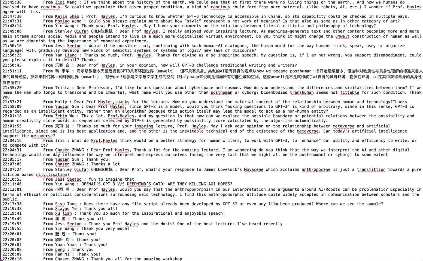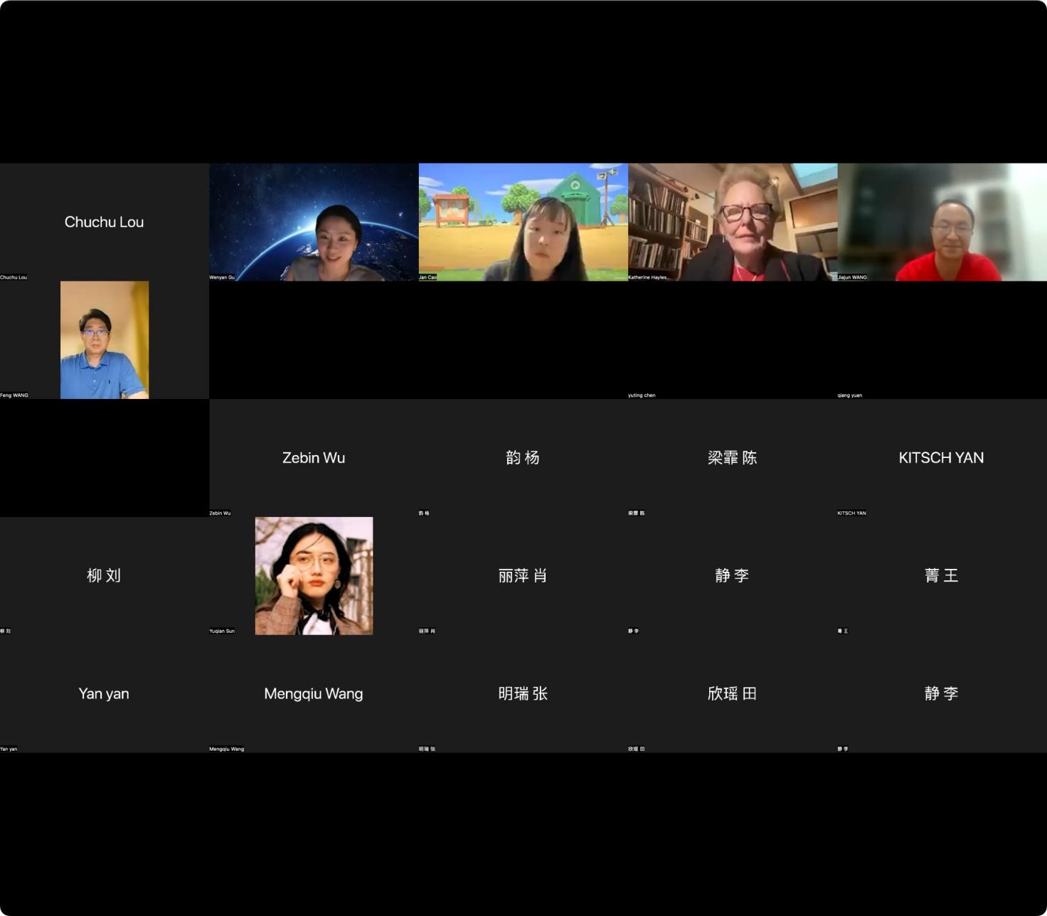 最后是自由提问答环节。与会师生纷纷表示受益匪浅,并积极踊跃地向海勒教授提问,问题涉及人工智能、GTP-3、后人类、元宇宙、人类世等诸多领域,海勒教授也对这些问题作出了不乏幽默的精彩回答。在热烈的讨论氛围中,本场讲座圆满落下帷幕。