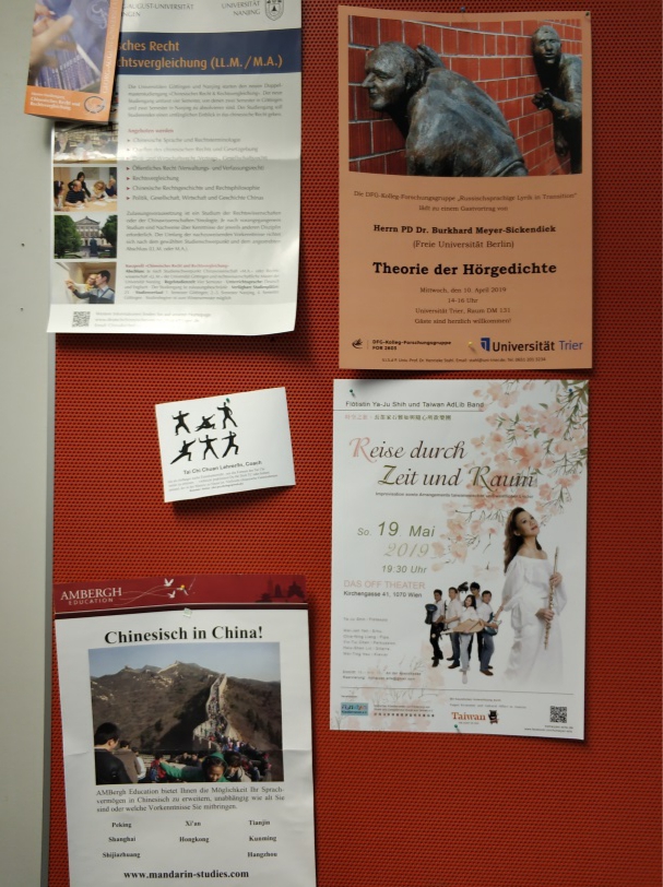 特里尔大学的国际学生中心(Internationales Zentrum)为留学生安排了语伴项目,以当地学生和留学生结对的方式提供学习和生活上的帮助。报名后不久会收到IZ的邮件回复,就可以联系自己的语伴。短学期结束后,校方会统一组织选课,我就读的专业是汉学系,均为德语授课。专业课的类型主要有Vorlesung和Seminar,Vorlesung作为大班教学,学生较多,大部分为德国学生,因此老师语速较快,一开始比较难听懂,也很难集中注意力。不过在坚持过后,听力水平会有不小的进步。而Seminar作为小规模的研讨课,课堂氛围比较活跃,学生们往往针对一个问题各抒己见,共同探讨。交流期间,我选读了一门跨文化交际课,一门关于中国“异域观”的研究课,还旁听了一门德语系的文学理论课。前两门课虽然和我的专业有些距离,但内容丰实,贯通古今,依然受益匪浅;后一门课主要讲授17世纪的德国文学理论,和我的专业重合度相对更高,对我的研究课题有所帮助。此外,德国高校的课堂有独特的akademische Viertelstunde(学术15分钟),即课表上写的虽然是整点上课,其实会在整点后15分钟才开课。在这15分钟里,学生通常会作一些日常交流,增进彼此了解。