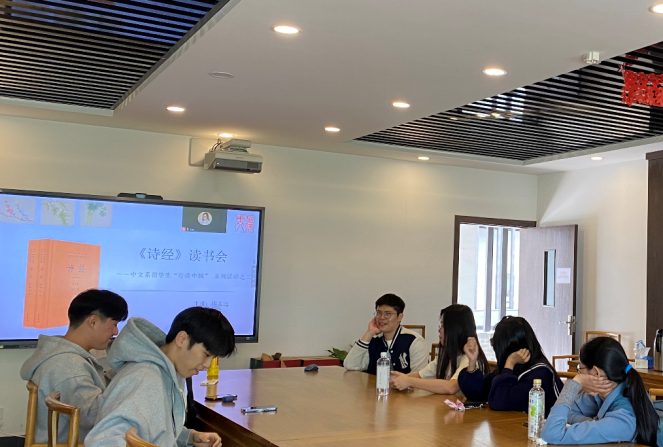 4月27日下午,读书会于文史哲楼4108会议室举行,由印志远老师担任领读老师。在印老师的带领下,留学生们诵读了《秦风·无衣》、《卫风·淇奥》等经典篇章,踊跃发言分享自己的读书心得和思想感悟。通过赏析解读和交流,留学生对《诗经》“思无邪”、自由奔放、健康而又热烈的生命咏唱都有了更加深入的理解,并在此基础上以诗传情,领略诗歌之美,与古人进行一场跨越时空的对话。